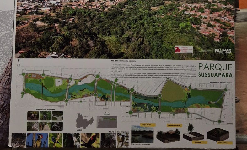 PALMAS/TO desenvolvido com diagnósticos físico, biótico e socioeconômico e projeto paisagístico com Soluções Baseadas na Natureza — integrando ciclovias, trilhas, áreas culturais e esportivas, recomposição florestal e dispositivos para redução de alagamentos e controle de erosão.