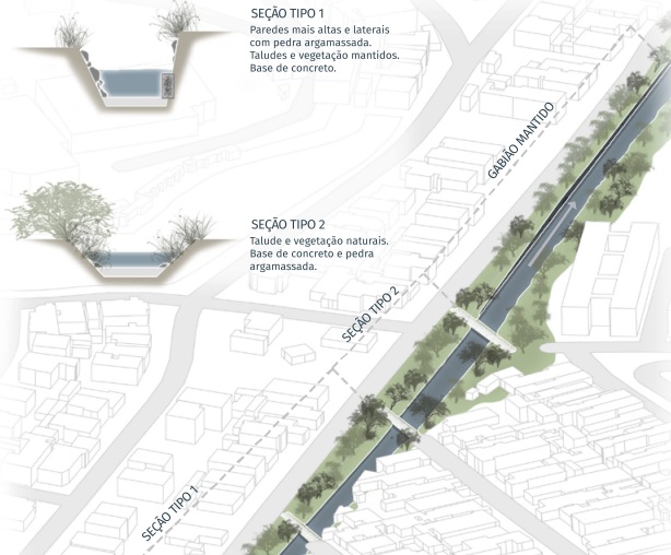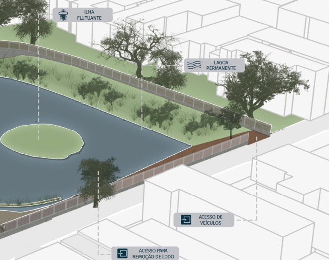 Como solução, mantém-se a capacidade de reservação e introduz-se uma lâmina d’água permanente, associada a dispositivos de tratamento natural (contenção de sedimentos, ecobarreira e wetlands). O córrego recebe seção mista com soluções adaptadas a cada trecho. A proposta integra drenagem, paisagem e lazer, fortalecendo a relação entre água e cidade.